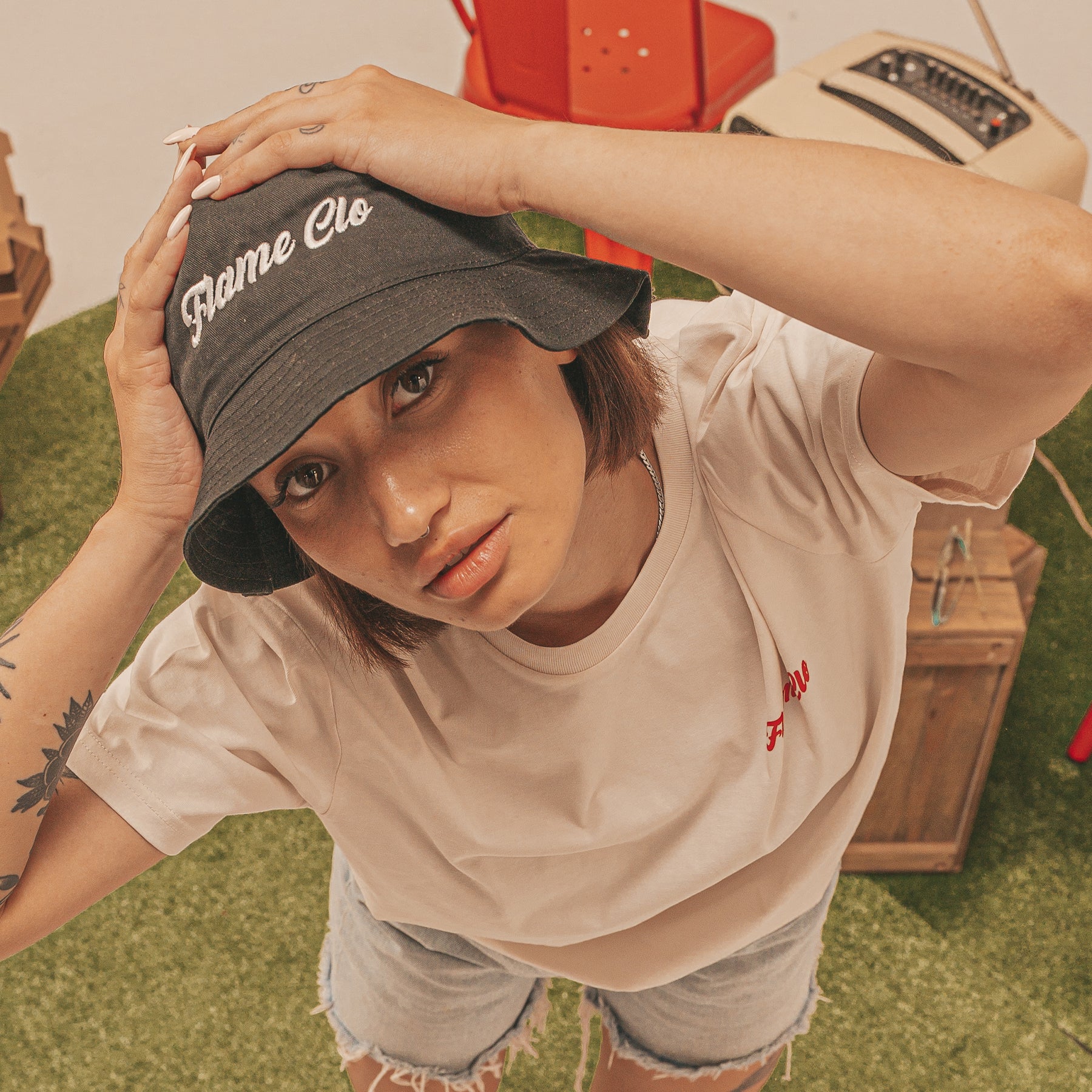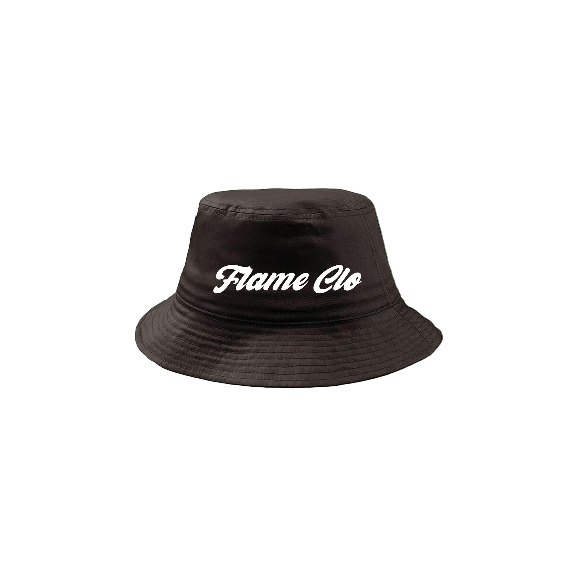 The Flame Black Bucket Hat with a white embroidery on the frontside.